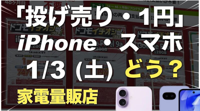 「1円」「投げ売り」「投げ貸し」iPhone・スマホ!2026年1月3日(土)家電量販店【ドコモ・au・ソフトバンク・楽天モバイル】iPhone17/16/16e。Pixel 9a/10。一括も