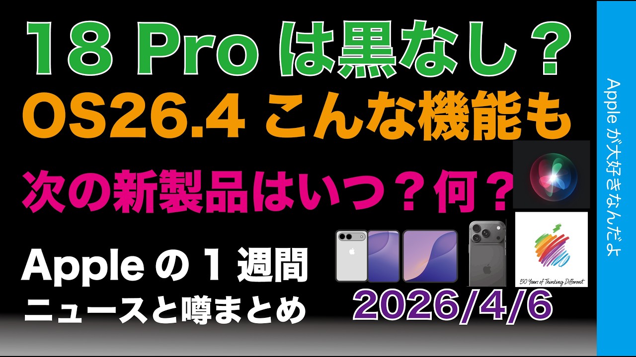 週頭恒例のまとめ動画です。50周年の話題から、新製品やOS26.4関連の補足情報、iPhoneの噂など気になったニュースをまとめています。